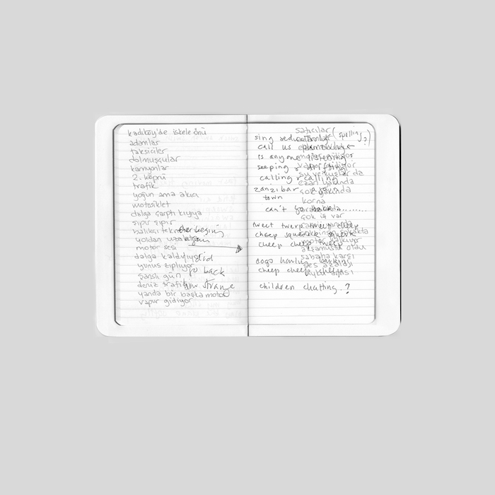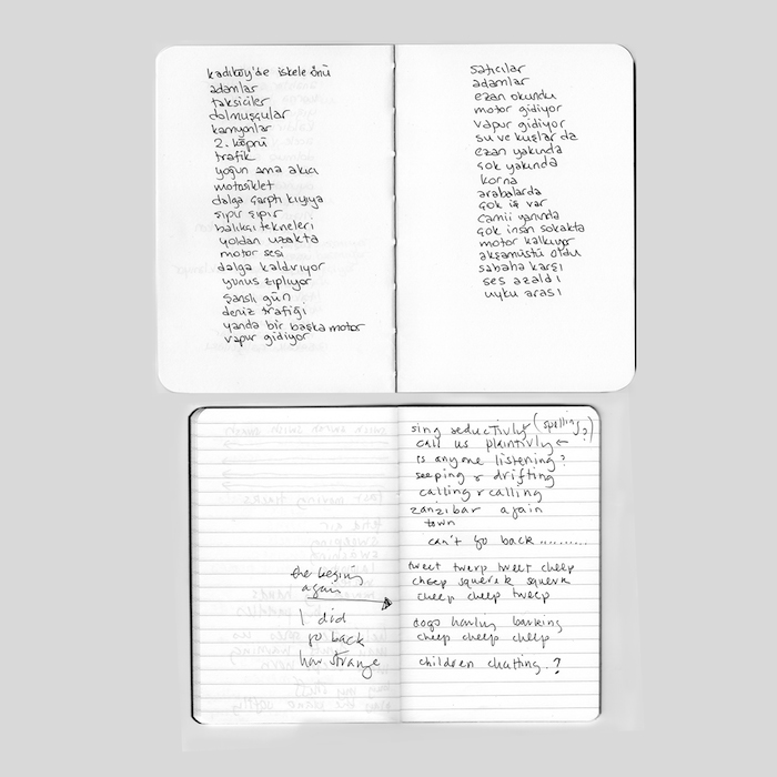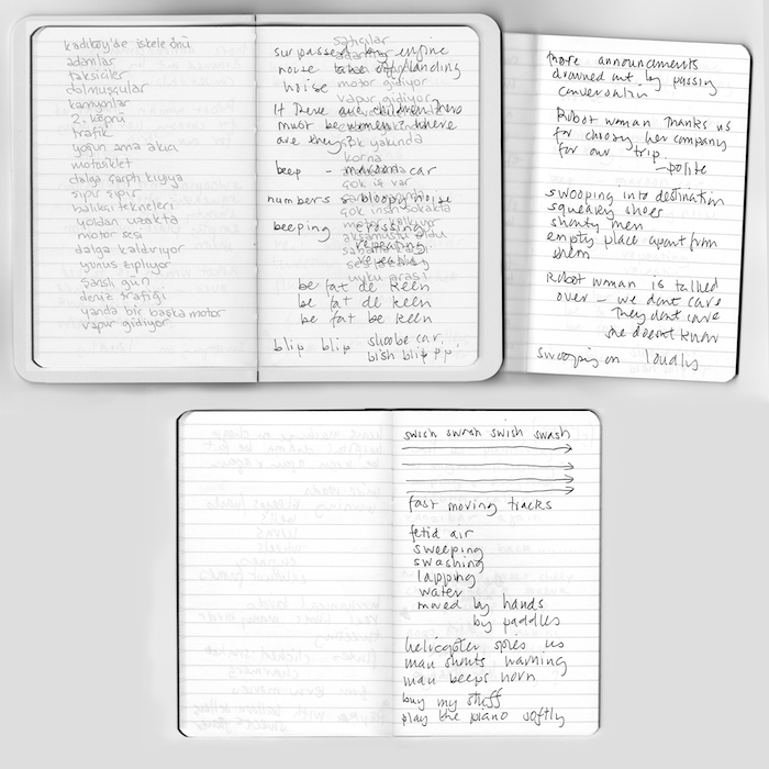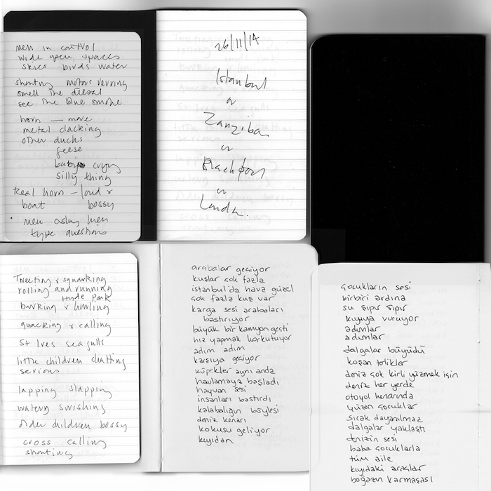 East [hyphen] West, Sound Impressions of Istanbul, it is a double limited edition vinyl recording with artist’s book, introduced and edited by Dr Mat Gregory. The reader is invited to share personal reflections on Istanbul by writers, Barkin Engin, Aylin Unal and Selcuk Artut, translated by Tuna Pase and Behzat Dirker. The folio book of interwoven leaves, threaded with images of the Bosporus, conceals fragments of re-told city soundscapes from the notebooks of musician Ekin Sanac and artist Lubaina Himid who responded to the evocative field recordings with text and voice, creating a new narrative layer.